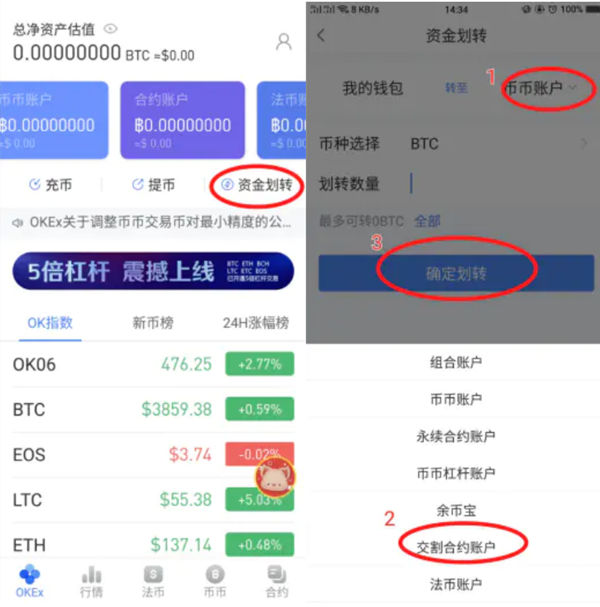 1.资金划转:(资金划转:如图,OKEX目前有我的钱包、币种账户、合约账户、法币账户等几个账户。如果新手买币后发现币种账户还是空的, 是因为你买了,币还在法币账户,交易前需要转入币种账户,如果进行合约交易,需要转入合约账户。)点击1 .----2。 交割合约账户--转账金额如图---3. 确认转账。