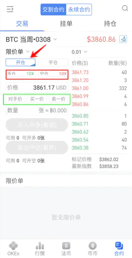 在交易界面点击开仓---看涨选择“买入开多”,看跌选择“卖出开空”---根据情况选择杠杆比例(红框内的杠杆比例 )-输入价格或选择绿色框开单并下单---输入数量---然后点击“买入开多”或“卖出开空”。买一价:指右侧第一个买单的价格,卖一价也是如此。对手价:对手的价格,如果你开多单,对方会有一个空单,就是对手的单。 如果用户选择交易对手价格下单,只能输入下单数量,不能输入下单价格。 系统在收到订单时会读取当前最新的交易对手价格(如果用户买入,交易对手价格为卖出1价;如果是卖出,交易对手价格为买1价),下达一个此对手价的限价委托。