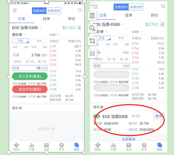 开仓举例:EOS当周交易--限价单--买入开多10个EOS(10个EOS实际上只抵押了1个EOS。因为10倍杠杆。)