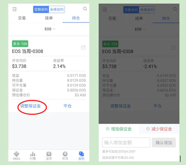 此时成交了:当前的持仓状况,10倍杠杆,看多,扣掉手续费,剩余持仓量,目前收益率2.14%,开仓均价3.738. 成交后,保证金是可以调整,如果行情开始下跌,快爆仓了,但是你依然坚信会涨,就可以补保证金,补了保证金后,强平价格就会相应的变化。