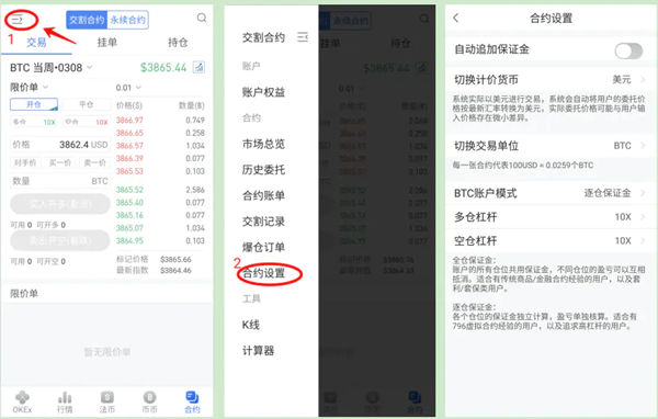 (也可以设置为张。每张合约代表100美元的BTC,或者10美元的其他币种:LTC、ETH、EOS等。个人觉得设置对应币种更方便)账户模式:选择逐仓保证金(操作时建议使用逐仓模式)。 用户在建立合约交易账户时,需要选择保证金模式。 不同的保证金模式有不同的交易保证金计算方式和风控体系。 当无持仓且无挂单时,即所有合约的保证金为0时,用户可以更改保证金模式。