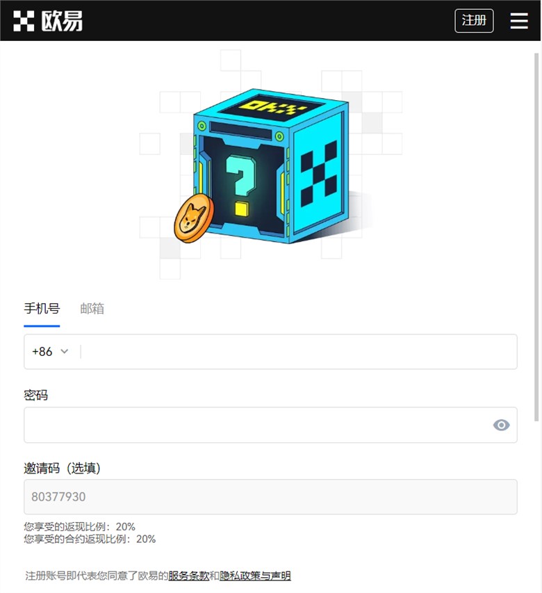 3. 设置密码和设置手势密码后即可以完成注册。 注意事项: 如果你的电话号码不小心遗失了,你的账号也不能登陆,你可以通过你的账号绑定邮箱,将你的身份证和你的联系方式(原件)发到我们的官方邮箱:service@okx.com。二、邮箱注册 1. 打开欧易OKXAPP,点击页面右上角登录/注册按钮,进入登录页面,点击右上角注册,进入注册页面。
