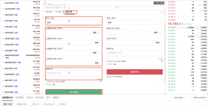 开多单为例:【开仓】— 选择【止盈止损】、【双向】—输入【止盈触发价格】、【止盈委托价格】与【止损触发价格】【止损委托价格】—【数量】—点击【买入开多】。