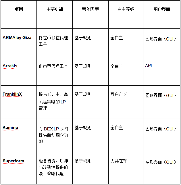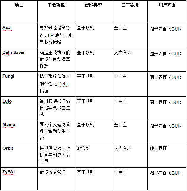 本文聚焦代理式金融在去中心化金融(DeFi)中的零售端应用,全面梳理现已上线、专注于为个人用户提供服务的自动化代理项目。为此,项目团队与行业内数十个团队进行了长时间调研与访谈,最终整理出一份经过严格筛选的活跃项目清单,按产品类别进行归类,并对每类代表性产品加以标注。
