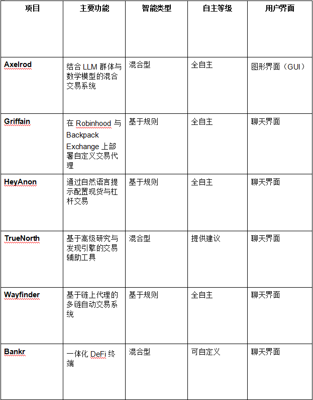 交易类代理是大众最常联想到的代理式金融产品。这类代理通过自动调仓或选择买卖资产来管理用户资金。要实现自动交易,代理系统通常需具备交易权限、资产访问、预算管理、预设策略与高质量数据等组件。以下为当前支持一项或多项功能的项目列表: